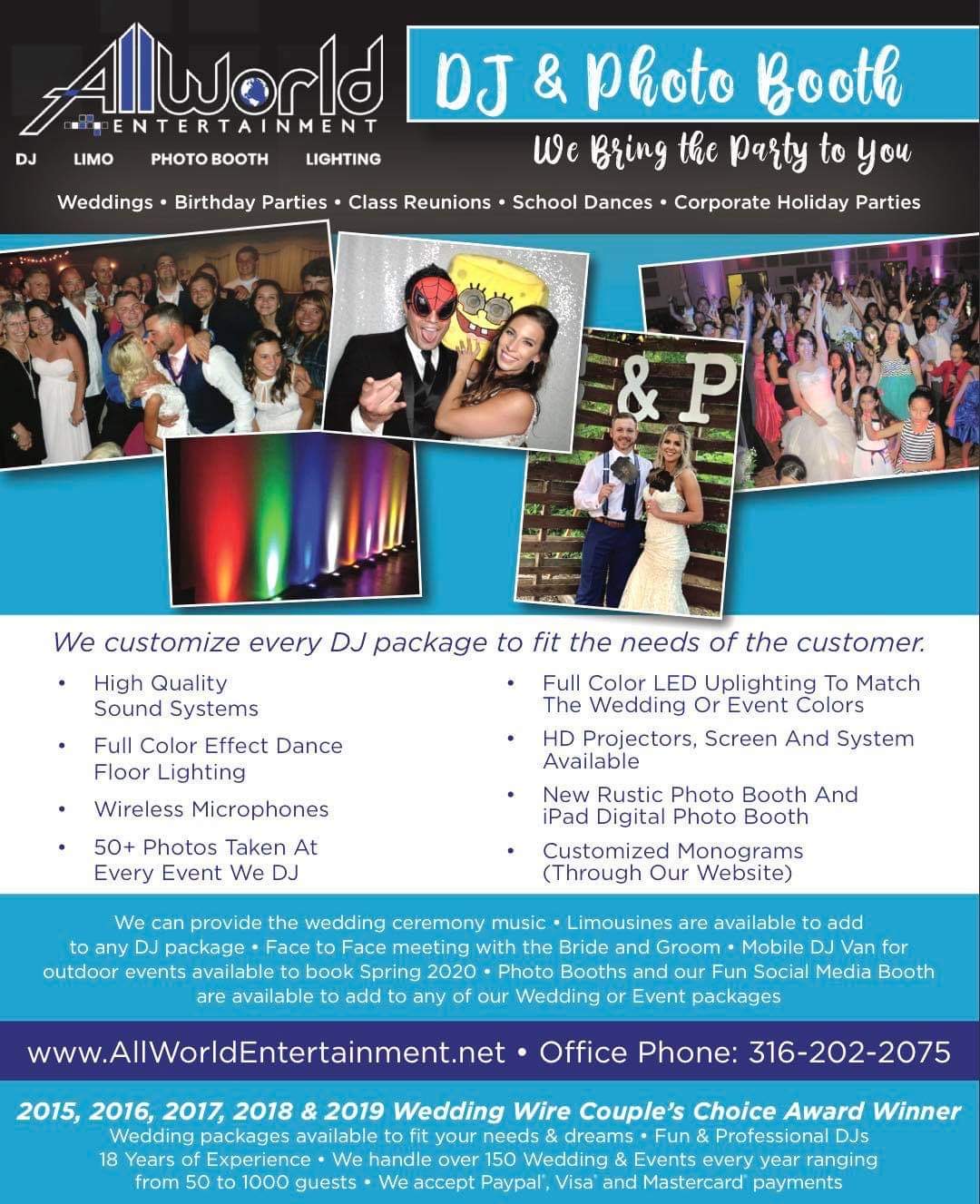 When you book All World Entertainment DJ Services you can count on the best of the best. We've heard it all----DJs who show up with nothing more than an iPod and speaker or just don't show up at all. That won't be the case with us. We care deeply about ensuring that every party we perform at creates a memorable experience that guests can enjoy. Our music library includes over 25,000 songs ranging from the 1950s to today's best hits! We've been in business for over 17 years and we've worked at over 100 events of all types.